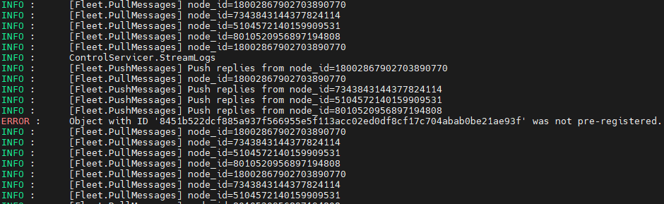 It seems that the first stage of communicating a message (which does the object pre-registration – you can thing of “objects” as the serialized blobs that comprise a RecordDict, which is the payload type of all Message objects) fails. But even though it fails, the second stage of communicating a message (i.e. actually pushing all the serialized blobs) goes ahead triggering the ERROR: Object with ID ... was not pre-registered you observe.